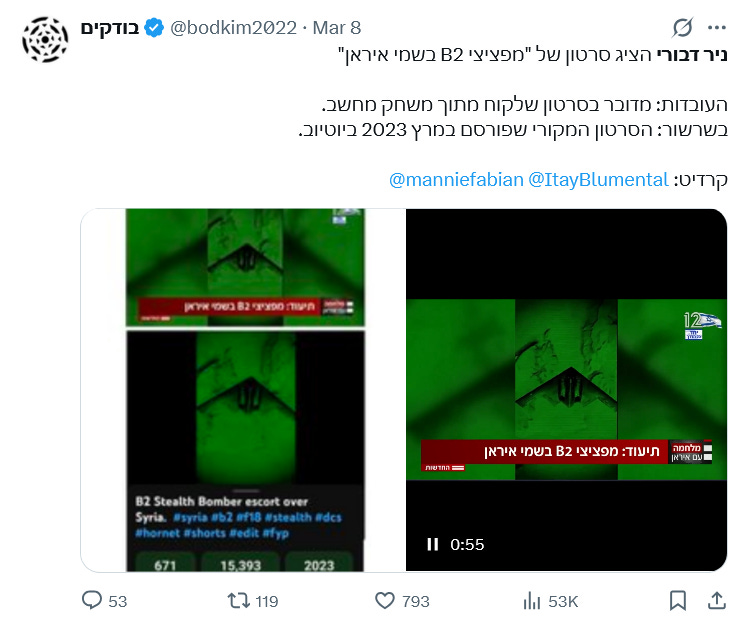 באולפן חדשות הערב של ערוץ 12, עמליה דואק הכריזה בדרמטיות: “חוזרים עם התיעוד הזה, שמביא לנו ניר דבורי. שימו לב, מפציצי B2 בשמי איראן”. על המסך הופיע סרטון בצבע ירקרק, מדמה צילום לילה, של מפציץ חמקן מלווה במטוסי קרב. לאחר השידור התברר מהר מאוד שלא מדובר בתיעוד של חיל האוויר האמריקאי, אלא בקטע מתוך משחק מחשב, סרטון שפורסם ביוטיוב עוד בשנת 2023.